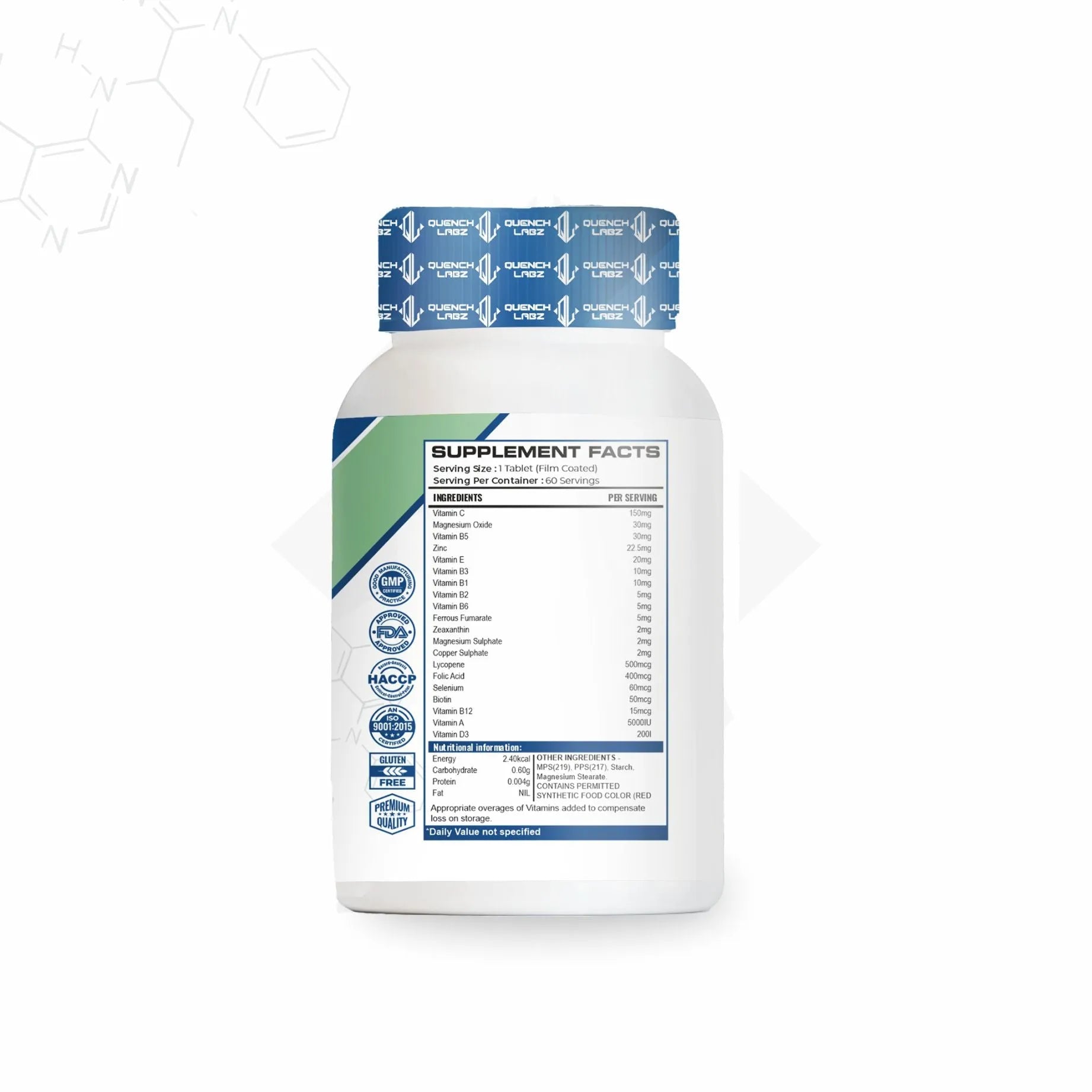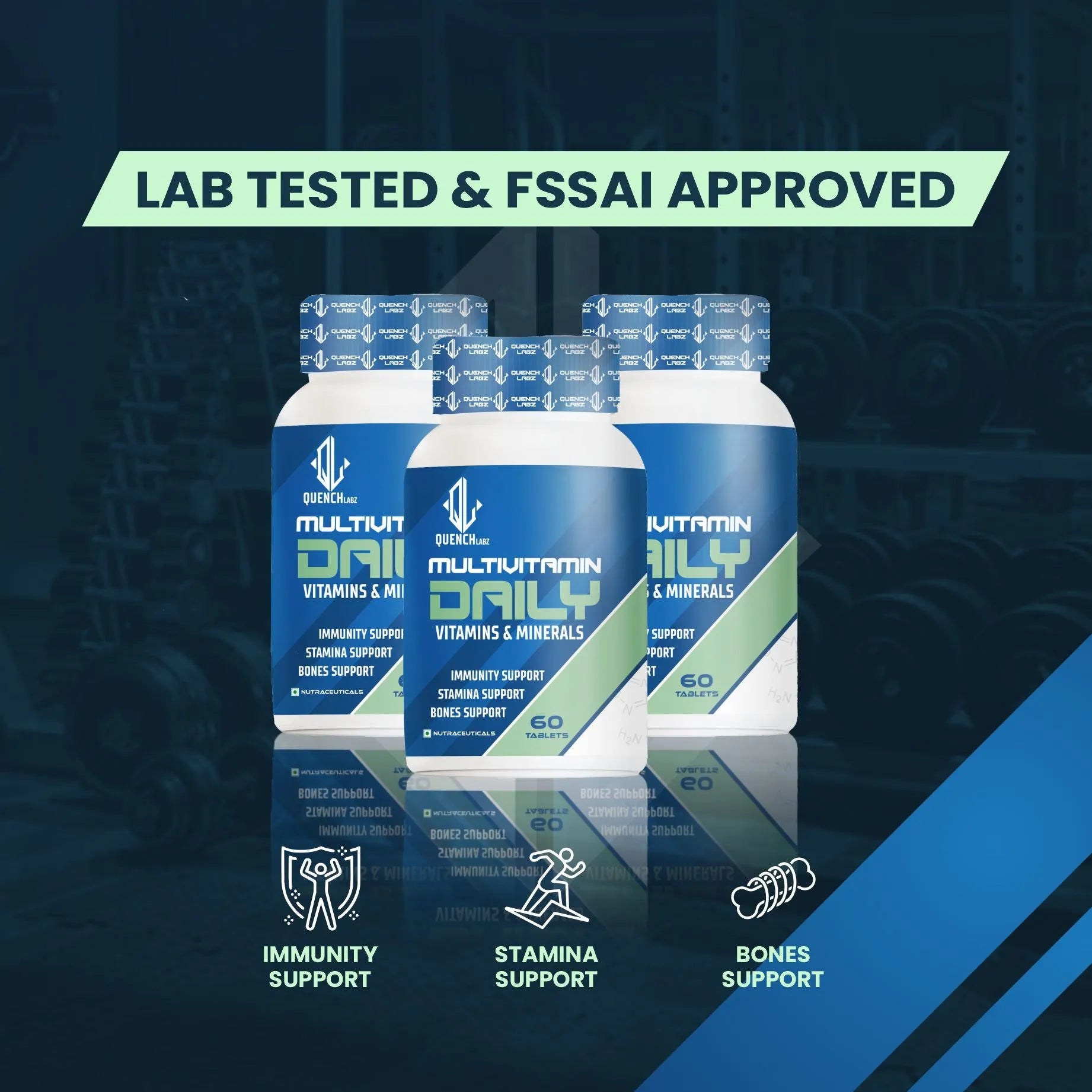 - الفيتامينات والمعادن المحددة المضمنة في Quench Labs Daily Multi-Vitamins