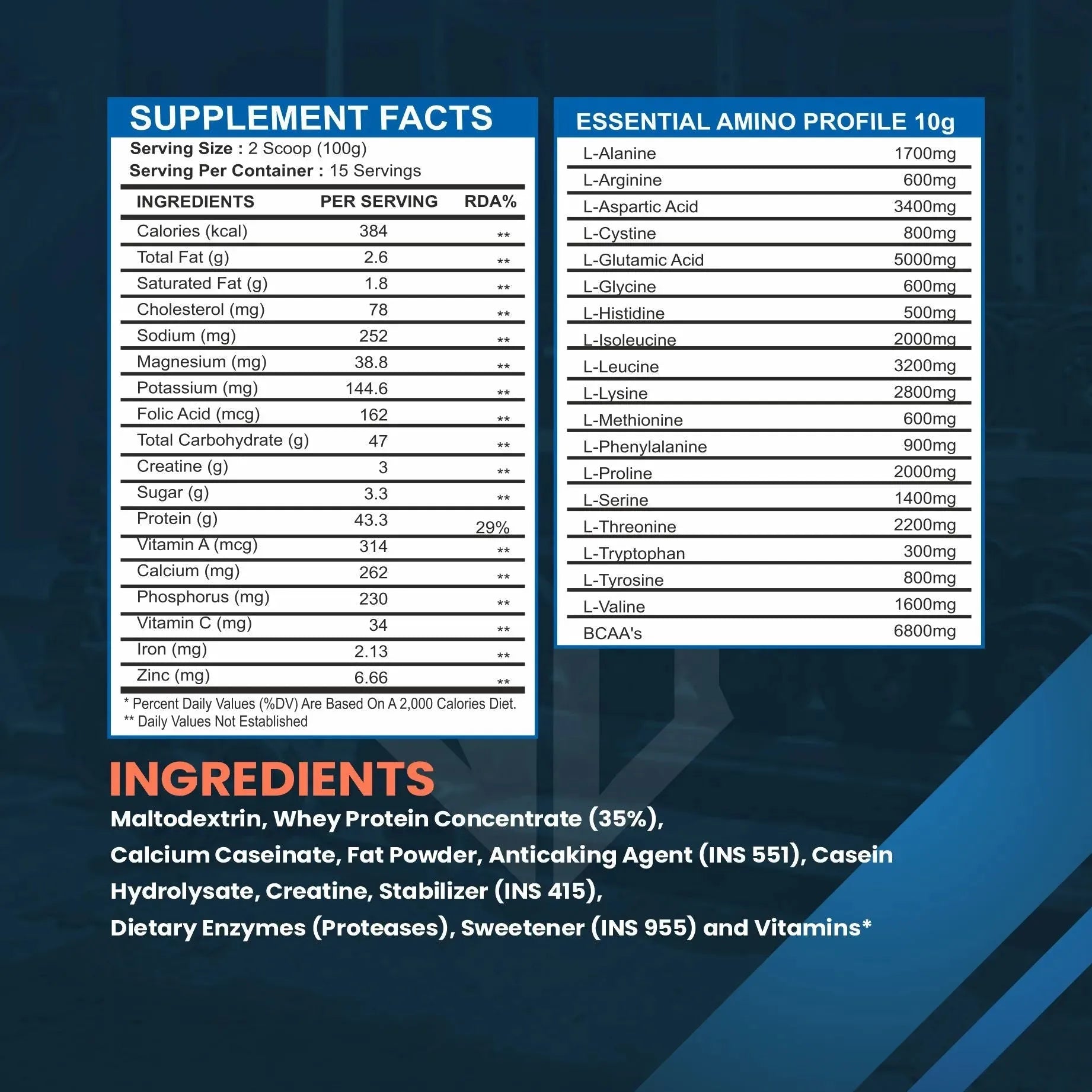 تحتوي تركيبتنا على كمية كبيرة من البروتين الذي يساعد على إصلاح العضلات وتعزيز النمو في كل وجبة، وهي مصممة لمساعدتك على التعافي بشكل أسرع، والنمو بشكل أقوى، والشعور بالتحسن.