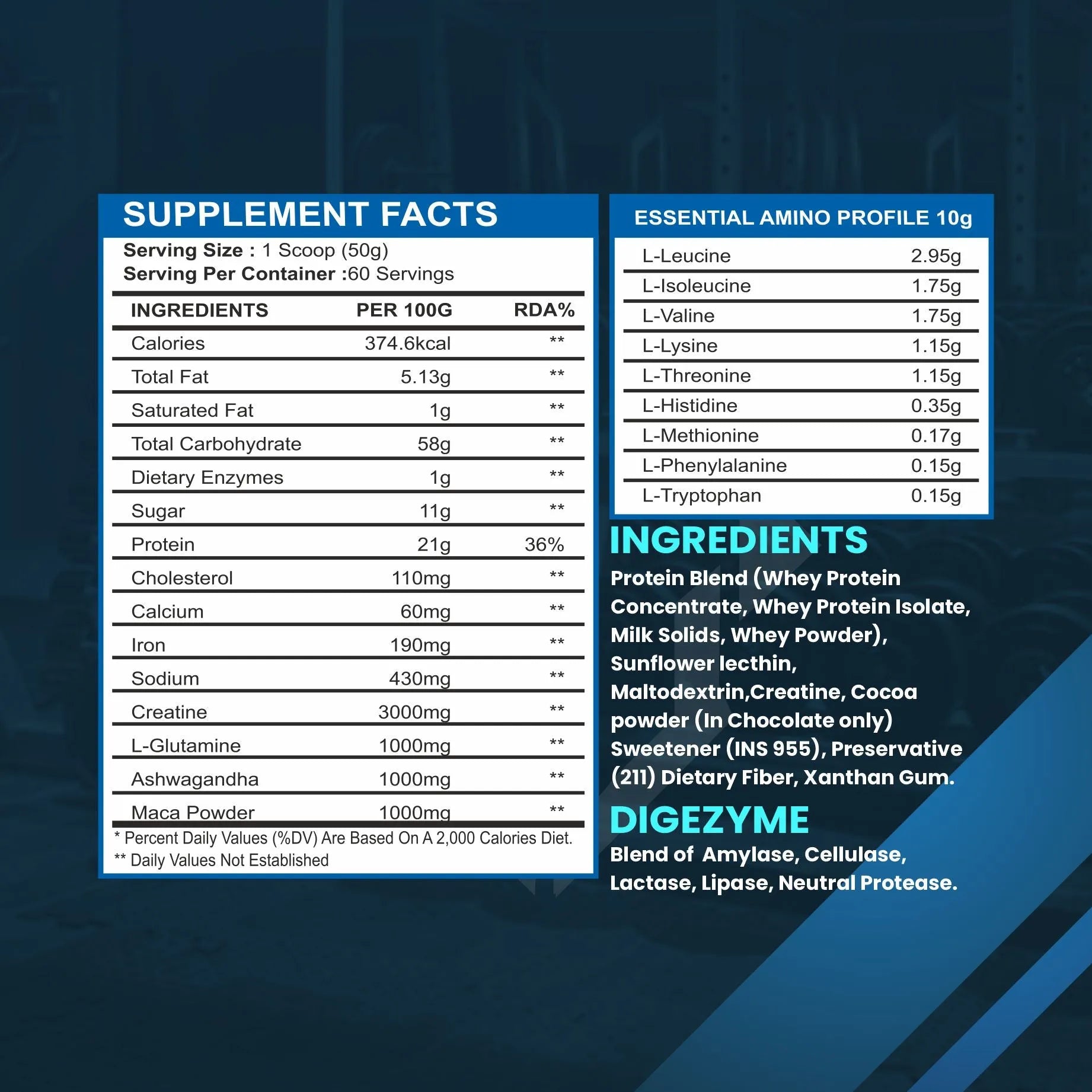 يتضمن Nitro Mass Gainer مكونات تم اختيارها علميًا ومصممة لتعزيز نمو العضلات والعافية بشكل عام: