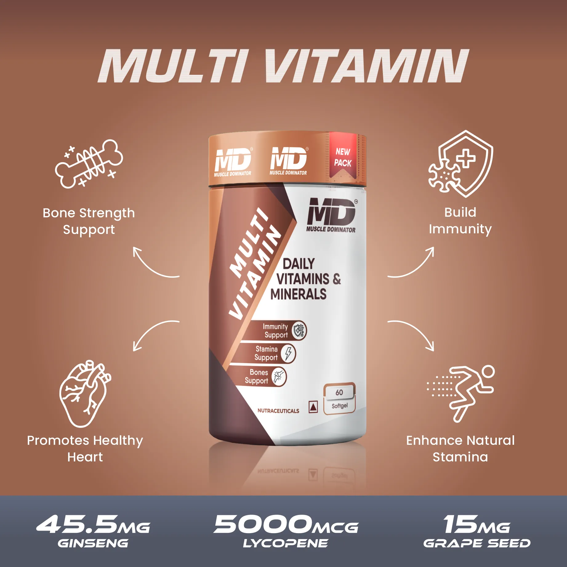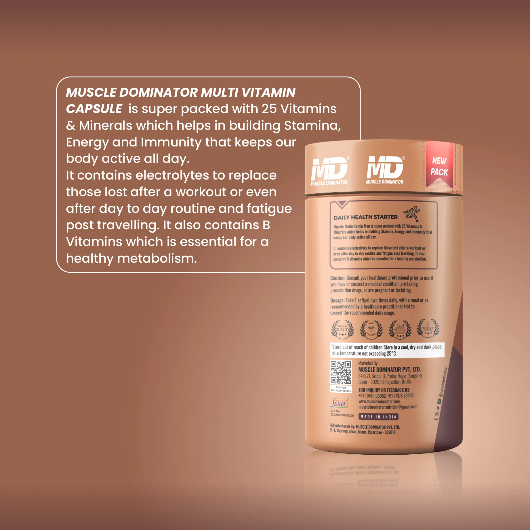 Muscle Dominator's Multivitamin for Men and women is super packed with 25 Vitamins & Minerals, which help in building Stamina, Energy and Immunity that keep our body active all day. It contains electrolytes to replace those lost after a workout...