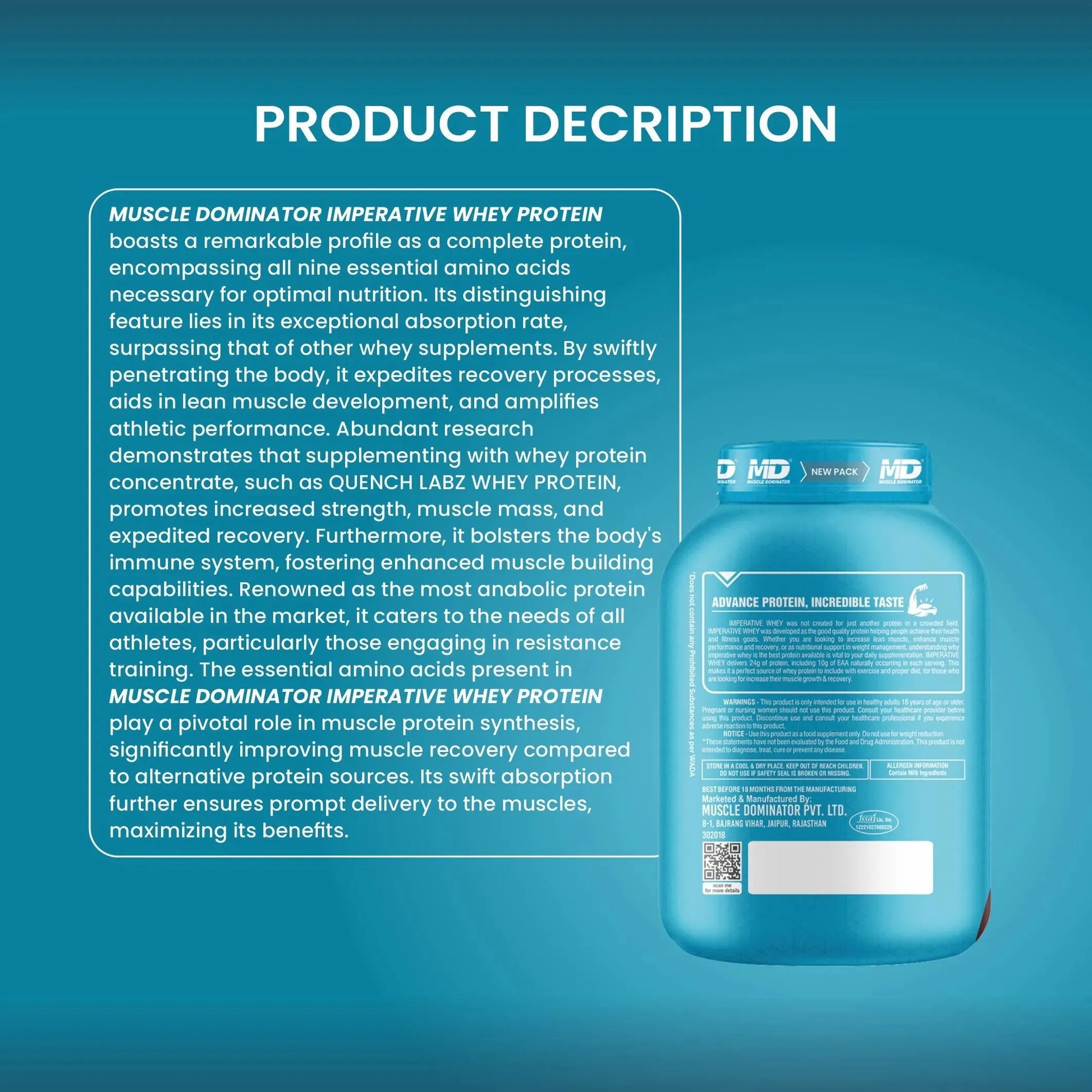 Imperative Whey Protein is a whey protein powder supplement manufactured by Muscle Dominator Private Limited, a company based in Jaipur, Rajasthan, India. It is available in a variety of flavors, including chocolate, Kulfi, cookies, and cream. The product claims to help users build muscle, recover from workouts, and improve their overall health. It is made with whey protein isolate, which is a type of whey protein that is considered to be the most bioavailable and digestible form of whey protein. Whey protein isolate is also a good source of essential amino acids, which are the building blocks of muscle. In addition to whey protein isolate, Imperative Whey Protein also contains a number of other ingredients, including: Creatine monohydrate: A compound that helps to increase muscle mass and strength. BCAAs (branched-chain amino acids): Essential amino acids that are important for muscle growth and repair. Glutamine: An amino acid that helps to reduce muscle soreness and fatigue. L-citrulline: An amino acid that helps to improve blood flow and nitric oxide production. Imperative Whey Protein is a well-rounded protein powder supplement that can help users achieve their fitness goals. It is made with high-quality ingredients and is available in a variety of flavors. However, it is important to note that protein powder supplements are not a substitute for a healthy diet and regular exercise. Here are some of the key benefits of Imperative Whey Protein: Helps to build muscle Supports muscle recovery Improves overall health Made with whey protein isolate, which is the most bioavailable form of whey protein Contains several other ingredients that are beneficial for muscle growth and repair Available in a variety of flavors If you are looking for a protein powder supplement that can help you achieve your fitness goals, Imperative Whey Protein is a good option to consider.