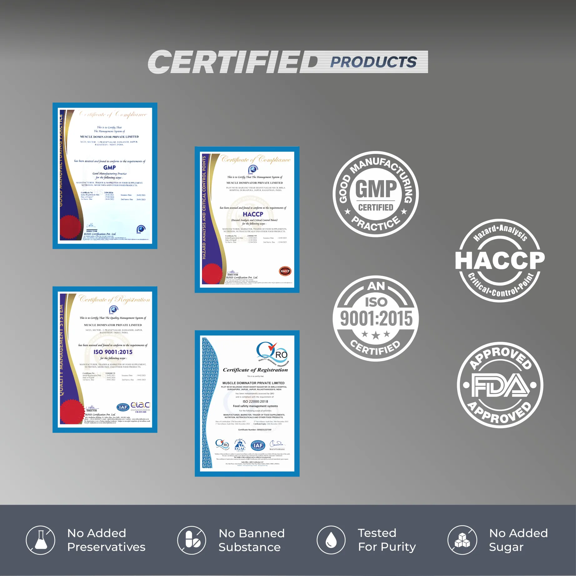हामीले ६.८ ग्राम आवश्यक एमिनो एसिड (EAA) पनि प्याक गरेका छौं। यी एमिनो एसिडहरू 'आवश्यक' हुन् किनभने तिनीहरू तपाईंको शरीरले उत्पादन गर्न सक्दैनन् र तपाईंको आहार मार्फत प्राप्त गर्नुपर्छ। तिनीहरूले मांसपेशी विकास र रिकभरीमा महत्त्वपूर्ण भूमिका खेल्छन्।