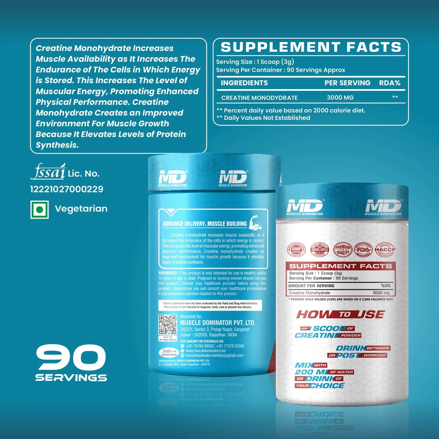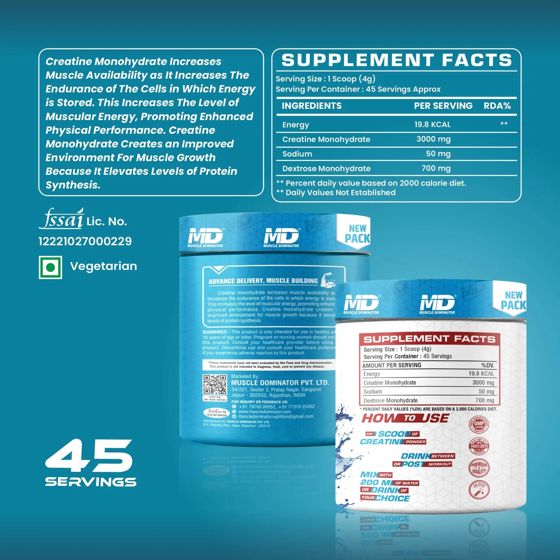 - शक्ति र सहनशीलता निर्माणको लागि, MD Creatine Monohydrate को प्रत्येक सर्विंगमा ३ ग्राम छिटो-अवशोषित क्रिएटिन हुन्छ।