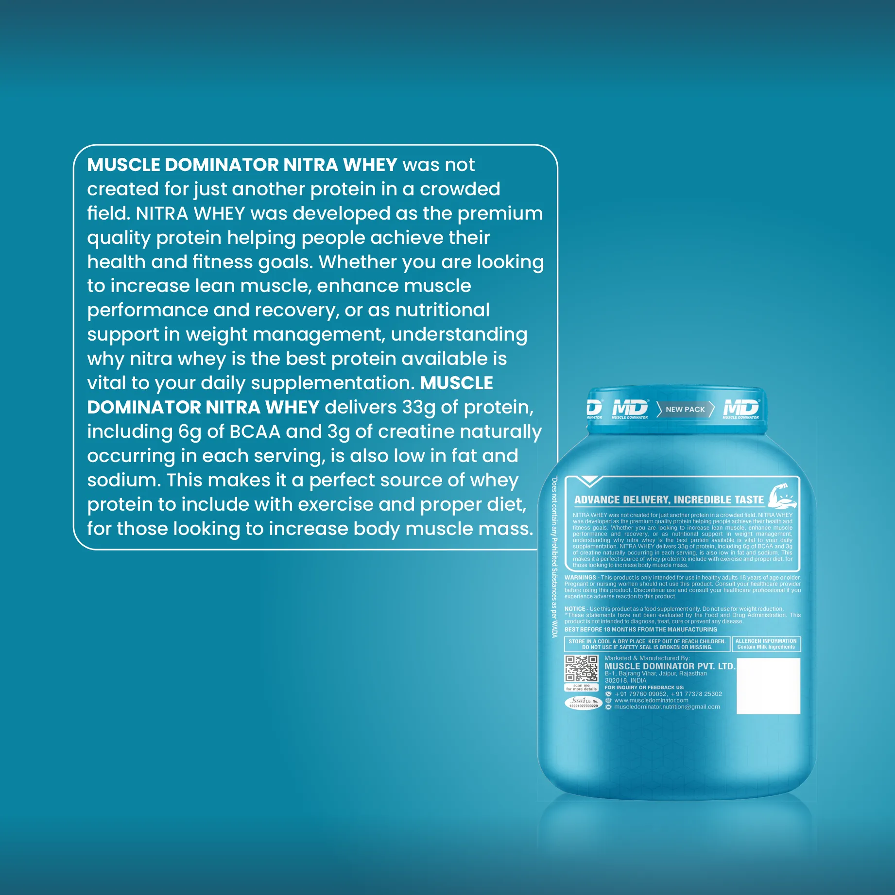 नाइट्रा ह्वी प्रोटिन मसल डोमिनेटर प्राइभेट लिमिटेडको ह्वी प्रोटिन सप्लिमेन्ट उत्पादन हो। यो ह्वी प्रोटिन आइसोलेट र कन्सेन्ट्रेटको मिश्रण हो, जसले प्रति सर्विङ उच्च मात्रामा प्रोटिन प्रदान गर्दछ। उत्पादनमा पाचन इन्जाइमहरू, हर्बल टेस्टोस्टेरोन बूस्टरहरू, र क्रिएटिन मोनोहाइड्रेट पनि समावेश छ।