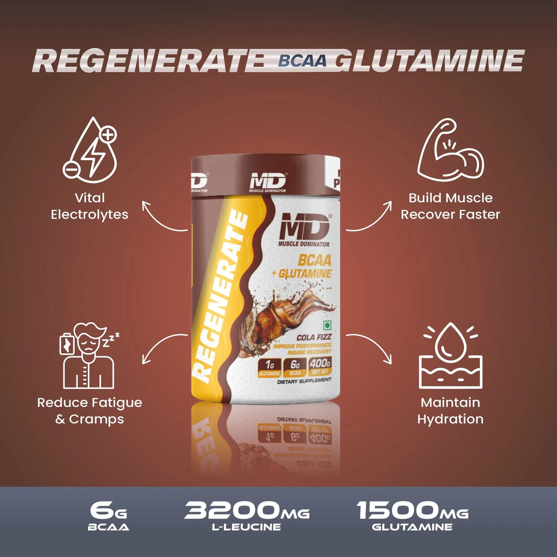 MuscleDominator BCAA + Glutamine is the perfect combination of branch-chain amino acid and glutamine. Our BCAA Powder is the best bunch and serves one scoop of 7000 mg instantized branch chain amino acid. 2000 mg glutamine with 1000 mg citrulline...