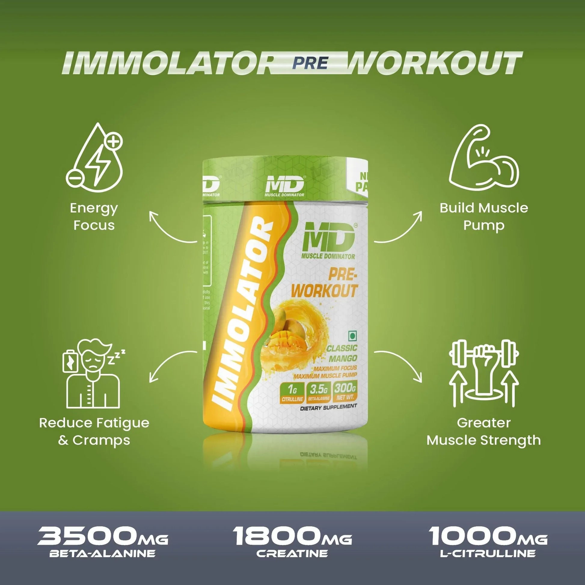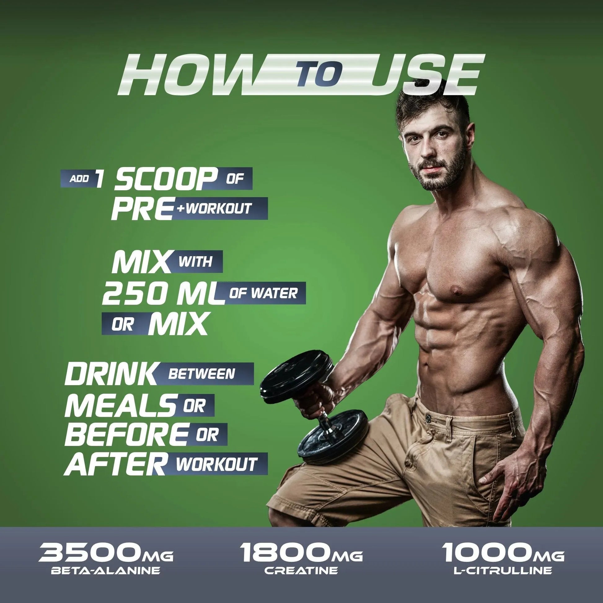 Muscle Dominator's Pre-Workout gives you the energy boost you need for peak performance in the gym. Make your body workout-ready so you can get the most out of your workout with an essential nutrient blend. Muscle Dominator Pre Workout provides you with the energy you need to perform at your peak. So, how exactly does it work? MD Pre-workout is an excellent pre-workout supplement for gaining a competitive advantage in your sport, whether you are an athlete, sportsperson, or an active fitness enthusiast. An intelligent combination of the Explosive energizing blend containing Beta-alanine, Creatine monohydrate, L-Citrulline, L-arginine, vitamin C, B3 is combined to boost energy and activate your muscles for training. This nutrient blend improves muscle endurance, energy, and performance during high-intensity exercise. Caffeine, Agmatine sulfate and Betaine in an alertness amplifier matrix blend help increase alertness and focus. Blood flow booster made of essential nutrients L-Arginine, L-citrulline increases blood flow and thus activity efficiency. MD Pre Workout ensures that your body is properly prepared to benefit from your workout and training.